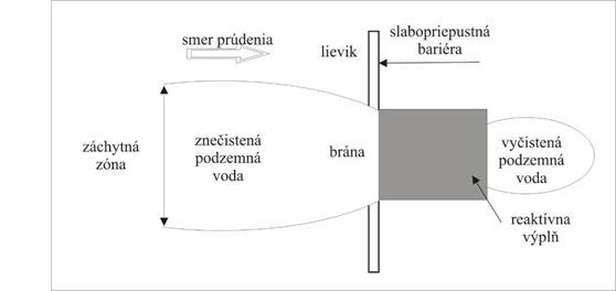 BRB sa môžu inštalovať ako kontinuálne steny alebo ako tzv. systém lievik – brána (funnel-and-gate), resp. drén – brána (trench-and-gate) (Bowles, 1997; Carey et al., 2002). Kontinuálne steny (obr. 4.2.10) tvorené priepustnou reaktívnou výplňou sú najjednoduchšou formou BRB. Systém „lievik – brána“ (obr. 4.2.11) má časť tvorenú nepriepustnou podzemnou stenou, ktorá zvádza podzemnú vodu do reaktívnej časti. Použitie tejto konfigurácie podzemnej steny často umožňuje lepšie zachytenie kontaminačného mraku a optimálne umiestnenie reaktívnej časti. Na lokalitách s príliš heterogénnym prúdením podzemnej vody umožňuje tento systém umiestniť reaktívnu bránu v priepustnejšej časti kolektora a tam, kde nie je distribúcia kontaminantu uniformná, umožňuje lepšiu homogenizáciu koncentrácie kontaminantov pred vstupom do reaktívnej brány (Gavaskar et al., 2000). Použitie technológie s viacerými bránami je vhodné tam, kde je potrebné zaistiť požadovaný čas zdržania, predovšetkým na lokalitách, kde je kontaminačný mrak široký, pri vysokej rýchlosti prúdenia a tam, kde je veľkosť reaktívnej brány limitovaná spôsobom inštalácie (napr. kesóny).