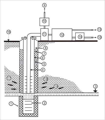 Vysvetlivky: 1 – obsyp, 2 – perforácia, 3 – hladina voľnej fázy uhľovodíkov, 4 – odsávacie potrubie, 5 – bentonitové tesnenie, 6 – paženie, 7 – zapažnicová cementácia, 8 – tesniaca hlava (uzáver vrtu), 9 – výstup vzduchu, 10 – čistička vzduchu, 11 – vákuové zariadenie (pumpa), 12 – oddeľovacia nádrž (uhľovodíky/voda), 13 – výstup uhľovodíkov, 14 – čistička vody, 15 – výstup vody, 16 – povrch terénu, 17 – aeróbna biodegradácia, 18 – bioventing, 19 – pohyb uhľovodíkov smerom k vrtu.