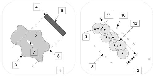 Vysvetlivky: 1 – koncepčný diagram, 2 – dizajn čistenej oblasti, 3 – smer prúdenia podzemnej vody, 4 – šírka čistenej zóny, 5 – dĺžka čistenej zóny, 6 – znečistená oblasť, 7 – zdroj znečistenia, 8 – čistená plocha, 9 – injektážny vrt, 10 – monitorovací vrt (sonda), 11 – jadrový vrt, 12 – reaktívna oblasť.
