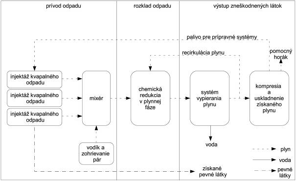 Premena organických kontaminantov na znovu použiteľné alebo skládkovateľné produkty prebieha v nádobe reaktora. Plynná zmes z TRBP alebo iného prípravného zariadenia víri okolo stredovej antikorovej rúry a ohrieva sa vertikálnymi radiačnými rúrami pomocou vnútorných ohrievacích prvkov. Reakčný proces prebieha od dna stredovej rúry dopredu a trvá menej ako sekundu.