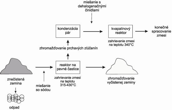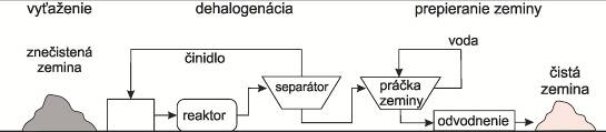 Pri dehalogenácii sa odstraňujú molekuly halogénov (najmä chlóru → dechlorácia) z organických znečisťujúcich látok a prebieha ich transformácia na menej nebezpečné látky (US EPA, 1990, 1995b, 1996b, 2006). Je to redukčný proces, pri ktorom sa buď nahradia halogénové funkčné skupiny, alebo sa parciálne, resp. celkovo rozložia a čiastočne volatilizujú kontaminanty. Kontaminovaný materiál sa pred samotným dehalogenačným procesom spravidla upravuje sušením, drvením, sitovaním a následne sa zmieša s vhodnými činidlami. Zmes sa uloží do vhodného reaktora, kde sa zahrieva na rôznu teplotu podľa typu technológie. Po skončení procesu sa dekontaminovaná zemina obyčajne zbaví zvyškov činidiel, ochladí sa, premyje vodou a vráti na pôvodné miesto (www.cpeo.org). Zjednodušený proces dehalogenácie je graficky znázornený na obr. 4.1.29.