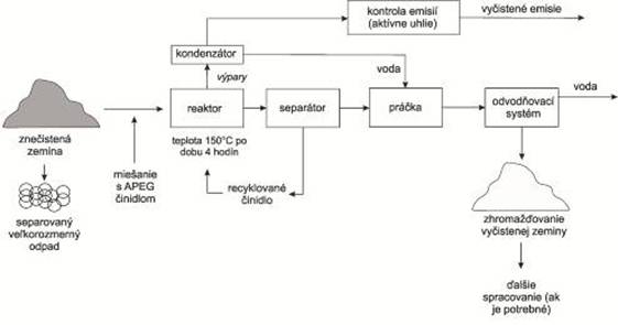 Pri procese glykolátovej dehalogenácie (APEG) sa používa chemické reakčné činidlo APEG alebo APEG-PLUS. Reagent APEG pozostáva z hydroxidu alkalického kovu (A) a polyetylénglykolu (PEG). Činidlo APEG-PLUS obsahuje navyše rozpúšťadlo dimetylsulfoxid (DMSO), ktoré zvyšuje reakčnú kinetiku procesu. Hydroxid sodný a hydroxid draselný sú dva najbežnejšie používané hydroxidy alkalických kovov. Glykolátová dehalogenácia pozostáva z piatich krokov: prípravy, vlastnej reakcie, separácie, prania a odvodnenia (obr. 4.1.30). V prípravnom kroku sa pôda odoberie, zbaví väčších častíc a preoseje. Pri samotnej reakcii sa znečistený materiál zmieša s reakčným činidlom, homogenizuje v reaktore a zohrieva 1 až 5 hodín pri teplote 100 – 180 °C. Dĺžka reakčného času závisí od typu a koncentrácie kontaminantov v materiáli. Vznikajúce pary sa oddeľujú kondenzáciou a plynné kontaminanty sa zachytávajú na aktívnom uhlí. V separátore sa činidlo APEG oddelí od pôdy a recykluje sa na opakované použitie. Spracovaná pôda obsahuje glykoléter, soli alkalického kovu a hydroxylované látky, ktoré sú v porovnaní s pôvodnými zlúčeninami menej toxické, resp. netoxické. Pri pracom procese prebieha extrakcia zvyškov reagenta a produktov dehalogenácie z pôdy a tá sa následne odvodní. Pôdne pH je potrebné pred uložením na pôvodné miesto neutralizovať pridaním kyseliny (US EPA, 1990; FRTR, 2008).