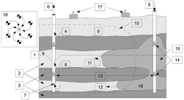 Vysvetlivky 1 – hladina podzemnej vody, 2 – priepustné vrstvy, 3 – nepriepustné vrstvy, 4 – podtlak odsávajúci pary, 5 – zatlačovanie pary, 6 – odsávanie pod tlakom, 7 – odčerpávanie podzemnej vody, 8 – čerpací vrt v ohnisku znečistenia, 9 – kondenzát odstraňujúci znečisťujúce látky, 10 – znečistená oblasť, 11 – parou destilované organické látky, 12 – podzemná voda je premieňaná na paru, 13 – stripovaná oblasť medzi vrtmi, vzdialenosť 18 až 30 m, 14 – elektródy elektricky ohrievajúce ílové horniny, 15 – suchá zóna s parou, 16 – parou stripované prchavé látky, 17 – tomografické sledovanie pohybu pár z monitorovacích vrtov, 18 – pôdorys rozmiestnenia vrtov.