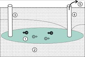 Vysvetlivky: 1 – vrt s anódou, 2 – vrt s katódou, 3 – prúdenie kontaminovaných iónov, 4 – premiestnenie kontaminantu, 5 – zemina.