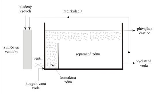 Na rozdiel od sedimentácie, pri flotácii sa častice (napr. vytvorené pri koagulácii) spájajú s mikrobublinkami a tieto agregáty majú výrazne nižšiu špecifickú hmotnosť ako voda. Preto stúpajú k hladine kvapaliny, t. j. proti pôsobeniu gravitácie. Mikrobublinky sa vytvárajú špeciálnymi dýzami blízko dna flotačnej nádrže v tzv. kontaktnej (reakčnej) zóne. V nej dochádza k spájaniu častíc (vločiek) s mikrobublinkami, ktoré sú tam vo veľkom prebytku v porovnaní s počtom častíc, ktoré prichádzajú vo vode do kontaktnej zóny z agregačných reaktorov (flokulácia). Na hladine separačnej zóny sa tvorí vrstva flotovaného kalu, ktorá sa mechanicky alebo hydraulicky odstraňuje. Upravená voda sa odoberá systémom zberného potrubia nad dnom separačnej časti flotačnej nádrže.