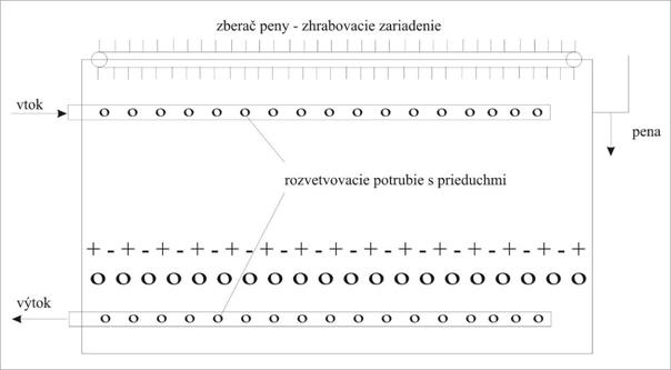 Vo flotačnej nádrži sú umiestnené elektródy a k nim je pripojený zdroj jednosmerného napätia 4 – 6 V. Elektrolýzou sa v celej nádrži vytvárajú priamo z vody veľmi jemné bublinky vodíka a kyslíka. Voda privádzaná na elektroflotáciu sa prítokovým žľabom a prepadovou hranou rozdeľuje rovnomerne po celej dĺžke elektroflotačnej nádrže. Cez nornú stenu priteká odpadová voda do flotačného priestoru. Tam sa odpadová voda intenzívne premiešava pôsobením plynových bublín produkovaných na elektródach. Tieto plynové bubliny sa zachytávajú na znečisťujúcich látkach, resp. vločkách hydroxidov v odpadovej vode. Vločky nadľahčené vzduchom sú potom obdobne ako pri tlakovej flotácii vynášané na hladinu a zhrabovacím zariadením sa premiestňujú do kalového priestoru. Zjednodušená schéma elektroflotácie je uvedená na obr. 4.2.51.