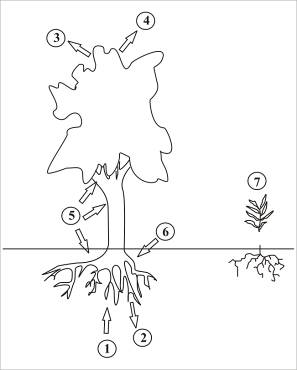 Vysvetlivky: 1 – akumulácia, 2 – rizofiltrácia, 3 – fytovolatizácia, 4 – evapotranspirácia, 5 – fytodegradácia, fytotransformácia, 6 – fytostabilizácia, 7 – fotoextrakcia.