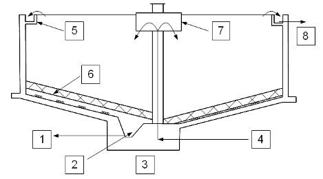 Vysvetlivky: 1 – zásobník materiálu, 2 – sedimentačná nádrž, 3 – prívod znečistenej vody, 4 – zahustený kal určený na zneškodnenie (sekundárne dočistenie), 4 – sedimentačný mechanizmus, 5 – prepad, 6 – vyčistená voda, 7 – sonda.