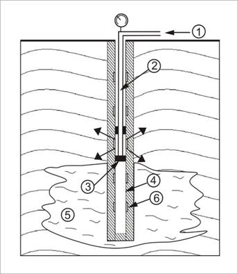 Vysvetlivky: 1 – injektážna zmes, 2 – injektážna trubka, 3 – dvojitý obturátor, 4 – manžetová trubka, 5 – preinjektovaná zóna, 6 – gumová manžeta.