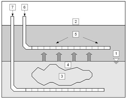 Vysvetlivky: 1 – hladina podzemnej vody, 2 – povrch terénu, 3 – znečistená zóna, 4 – pásmo nasýtenia, 5 – pásmo prevzdušnenia – drážkované paženie, 6 – extrakcia vzduchu obsahujúceho prchavé organické látky, 7 – miesto injektáže vzduchu.