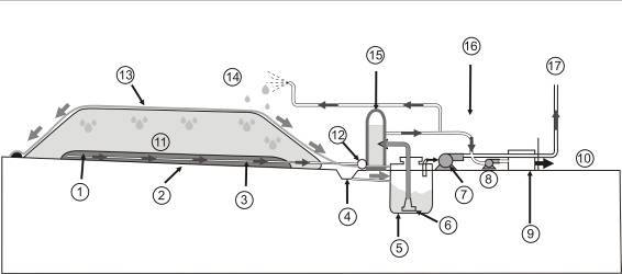 Vysvetlivky: 1 –pórovitý materiál, 2 – nepriepustná membrána, 3 – prevzdušňovací systém, 4 – drenážny kanál, 5 – separátor voda/vzduch, 6 – pumpa, 7 – kompresor, 8 – pumpa, 9 – čistička vôd, 10 – vyčistená voda, 11 – pôda, 12 – zberač vody, 13 –prekrytie, 14 – zavlažovací systém, 15 – zásobník vody, 16 – obslužné zariadenie.
