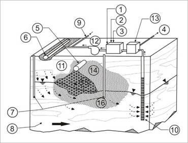 Vysvetlivky: 1 – filter, 2 – živiny, 3 – aerácia, 4 – odtok, 5 – zdroj znečistenia, 6 – infiltračná galéria, 7 – monitorovacie studne, 8 – prúdenie podzemnej vody, 9 – zdroj vody (ak je to nevyhnutné), 10 – čerpacia studňa, 11 – reinjektovaná voda, 12 – čerpadlo, 13 – čistenie vody (ak je to nevyhnutné), 14 – znečisťujúce látky v plynnom stave, 15 – znečisťujúce látky adsorbované, 16 – znečisťujúce látky rozpustené.