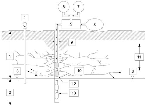 Vysvetlivky: 1 – pásmo prevzdušnenia, 2 – pásmo nasýtenia, 3 – hladina podzemnej vody, 4 – monitorovací vrt, 5 – prívod tlaku (regulačný systém), 6 – zdroj kvapaliny, 7 – zdroj výplachu, 8 – zdroj stlačeného vzduchu, 9 – rozvoľňovací vrt (otvorený/zapažený), 10 – rozširovanie puklín, 11 – zemina alebo skalná hornina, 12 – pohyblivá tryska, 13 – pukliny môžu byť rozširované aj v pásme nasýtenia.
