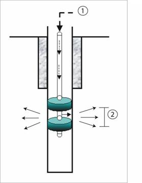 Najmä nevystrojené penetračné sondy umožňujú pomerne jednoduchý a pravdepodobne aj menej nákladný spôsob realizácie rozrušovania v niekoľkých polohách ležiacich nad sebou, vytvorených systémom tzv. pakrov (požadovaný vertikálny interval medzi jednotlivými polohami sa pohybuje v rozpätí 1,0 až 2,0 m). Princíp hydraulického rozrušovania je uvedený na obr. 4.2.24.