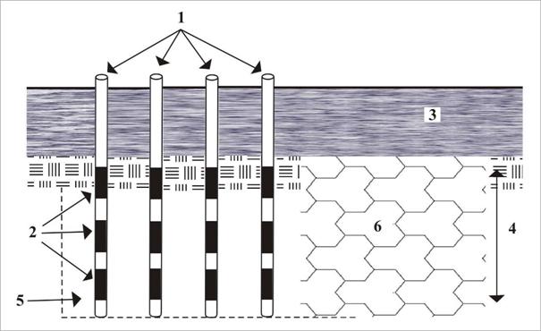 Vysvetlivky: 1 – detonačné vrty; 2 – časované nálože; 3 – nespevnené nadložie; 4 – skalné podložie; 5 – rozvoľňovaná oblasť; 6 – rozvoľnená časť skalného podložia.