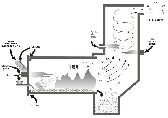 Rotačná pec predstavuje jemne naklonený rotujúci valec so žiaruvzdorným vnútrom (obr. 4.1.35). Cyklický pohyb zabezpečuje dvíhanie a klesanie pevných častíc odpadu (Roberts et al., 1998). Povrch odpadu a jeho kvapalné súčasti sú takto vystavené tepelným účinkom horenia prídavného paliva. Čerpateľné kaly sa do komory vpúšťajú cez dýzy. Teplota horenia sa pohybuje v intervale 700 – 1 300 ºC, pričom niekedy je teplota nižšia, aby sa predišlo troskovateniu odpadových materiálov. Rovnomerná distribúcia tepla k všetkým materiálom vnútri pece predstavuje dokonalé premiešanie spaľovaných zložiek. Pec je primárna spaľovacia komora, v ktorej sa pri vpustení kyslíka organické zložky odpadu odparujú a oxidujú. Nespálené prchavé látky prejdú spolu s horúcimi produktmi spaľovania z primárnej do sekundárnej spaľovacej komory. V nej prebehne úplné spálenie paliva, odpareného aj kvapalného odpadu. Plyny opúšťajúce pec sa pomocou špeciálnych zariadení (Venturiho plynová práčka, mokrý elektrostatický odlučovač) očistia od jemných častíc a kyslých plynov (HCl, NOx, SOx).