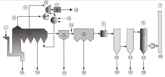 Vysvetlivky: 1 – odpad, 2 – kotol, 3 – E-filter, 4 – priemyselný (textilný) filter, 5,6 – šetrič, 7 – čistý plyn, para, 8 – saturovaná para, 9 – superzohriata para, 10 – turbína, 11 – generátor, 12 – elektrina, 13 – chladiaca voda, 14 – norit + vápenec, 15 – usadený popol, 16 – popol z kotla, 17 – popolček, 18 – zvyšok, zostatok, 19 – dočisťovacie zariadenie na plyn v prostredí HCl, 20 – chlorid vápenatý, 21 – dočisťovacie zariadenie na plyn v prostredí SO2, 22 – sádrovec, 23 – dočisťovacie zariadenie, 24 – voda, 25 – komín