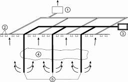 Vysvetlivky: 1 – zberač plynov, 2 – kanáliky na zber plynov, 3 – kompresor, 4 – znečistená zóna, 5 – injektážne vrty s horúcim vzduchom.