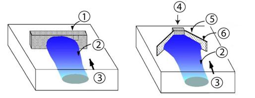 Existujú viaceré spôsoby inštalovania systémov reaktívnych bariér, ktoré optimálne zohľadňujú hydrogeologické podmienky na lokalite, rozptyl kontaminácie na lokalite a cenu samotného reaktívneho materiálu (US EPA, 1998b; Jirasko, 2004). V praxi je možné najčastejšie sa stretnúť s dvoma základnými typmi bariér (obr. 4.2.22):