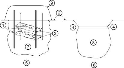 Vysvetlivky: 1 – elektródy, 2 – povrch terénu, 3 – elektrický prúd, 4 – zemina, 5 – počas vitrifikácie, 6 – po vitrifikácii, 7 – roztavená zemina, 8 – blok sklovitého vitrifikovaného materiálu.
