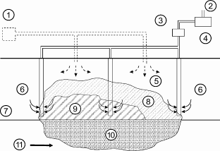 Vysvetlivky: 1– nádrž so živinami (nepovinné, záleží od podmienok na lokalite), 2 – vypúšťanie do atmosféry, 3 – kompresor, 4 –zariadenie na ošetrenie pár (ak je potrebné), 5 – živiny, 6 – prúd vzduchu, 7 – hladina podzemnej vody, 8 – plynná fáza, 9 – adsorbovaná fáza, 10 – rozpustená fáza, 11 – smer prúdenia podzemnej vody