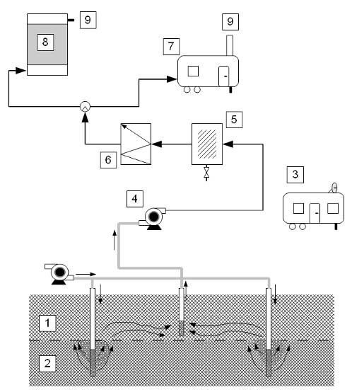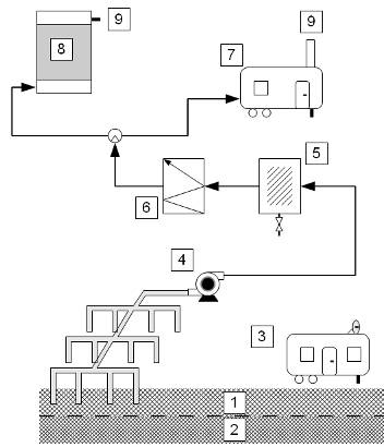 Vysvetlivky: 1 – pásmo prevzdušnenia, 2 – pásmo nasýtenia, 3 – mobilná analytická stanica, 4 – kompresor, 5 – separátor vody, 6 – tepelný výmenník, 7 – mobilná spaľovacia jednotka, 8 – sorpčná jednotka, 9 – uvoľňovanie plynov do ovzdušia.