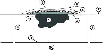Vysvetlivky: 1 – znečistená zemina, 2 – piesok, 3 – štrk, 4 – povrchová zemina, 5 – geomembrána, 6 – tráva, 7 – povrch terénu, 8 – monitorovací vrt, 9 – hladina podzemnej vody, 10– nasýtená zóna.
