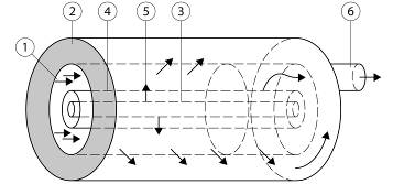 Vysvetlivky: 1 – znečistený plyn, 2 – katalyzátorová patróna, 3 – UV lampa, 4 – kremenný kryt, 5 – UV žiarenie, 6 – vyčistený plyn.