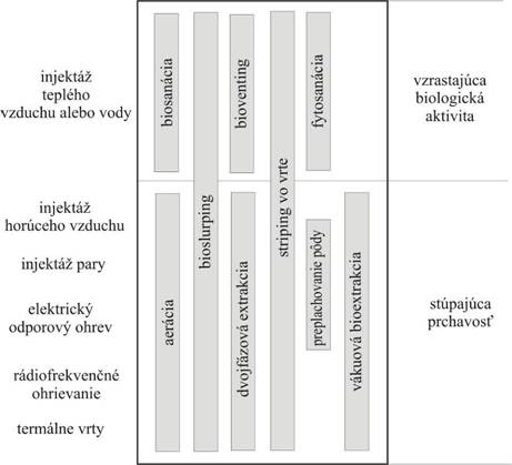 V praxi je možné napríklad využitie kombinácie rôznych metód a postupov v závislosti od potreby podporiť biologickú aktivitu v systéme alebo prchavosť látok. Niektoré príklady kombinácie metód tepelnej podpory s inými sanačnými technológiami a postupmi sú uvedené na obr. 3.2.1 (Motsch et al., 2002).