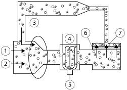 Vysvetlivky: 1 – prchavé organické látky, 2 – výpary, 3 – kompresia, 4 – kondenzátor (chladí prchavé organické látky a premieňa paru na kvapalinu, ktorá sa odstráni), 5 – kvapalné prchavé organické látky (odstránené kondenzátorom), 6 – membrána zvinutá do špirály (tiež odstraňuje prchavé organické látky), 7 – prchavé organické látky.