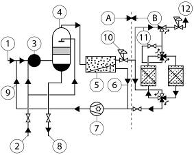 Vysvetlivky: A – 1. stupeň/membránová jednotka: 1 – vstup pár, 2 – prívod vody, 3 – kompresor V1, 4 – odlučovač, 5 – membrána, 6 – presakovanie, 7 – vákuová pumpa, 8 – odtok vody, 9 – recyklácia, 10 – koncentrát. B – 2. stupeň/jednotka tlakovej adsorpcie: 11 – obchvat, 12 – ventil.