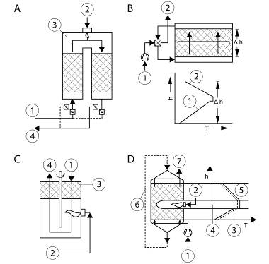 A) Regenerátor s pevným lôžkom: 1 – znečistený vzduch, 2 – pomocné palivo, 3 – reakčná zóna, 4 – vyčistený vzduch.