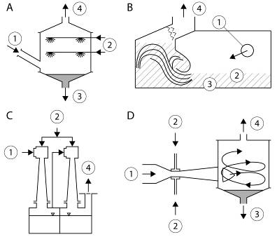 A – sprchový: 1 – znečistený plyn, 2 – voda, 3 – voda s prachom, 4 – vyčistený plyn,