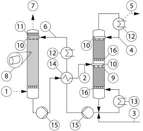 Vysvetlivky: 1 – znečistený plyn, 2 – nasýtená pracia kvapalina, 3 – dopĺňanie pracej kvapaliny, 4 – reflux, 5 – odstránené zložky, 6 – regenerovaná pracia kvapalina, 7 – čistý plyn, 8 – plášť absorpčnej kolóny, 9 – plášť regeneračnej destilačnej kolóny, 10 – distribútor kvapaliny, 11 – odparovač, 12– vodný chladič, 13 – parný ohrievač, 14 – výmenník tepla, 15 – čerpadlo, 16 – nosič výplne kolóny.