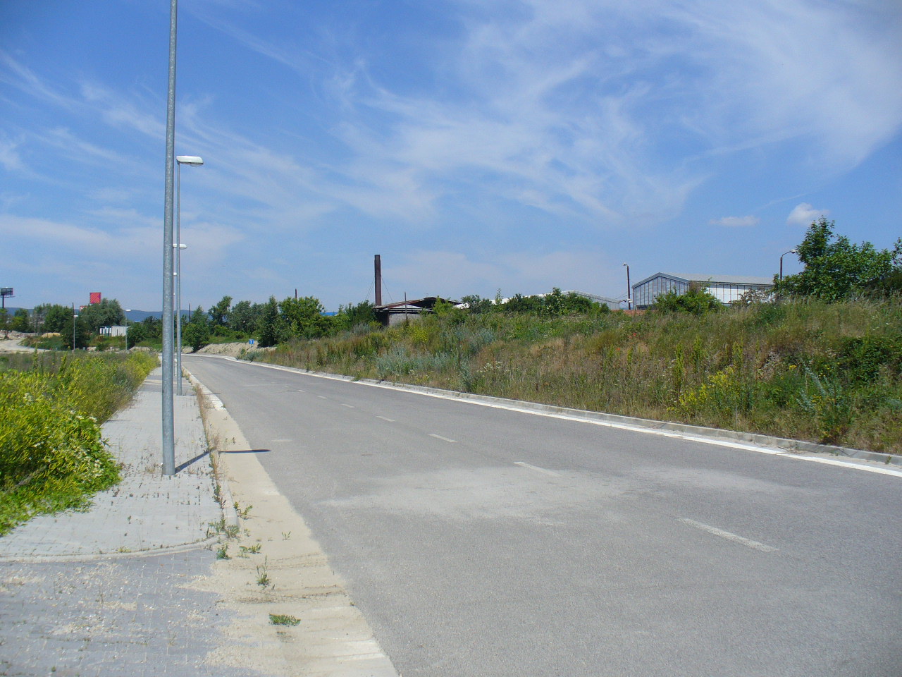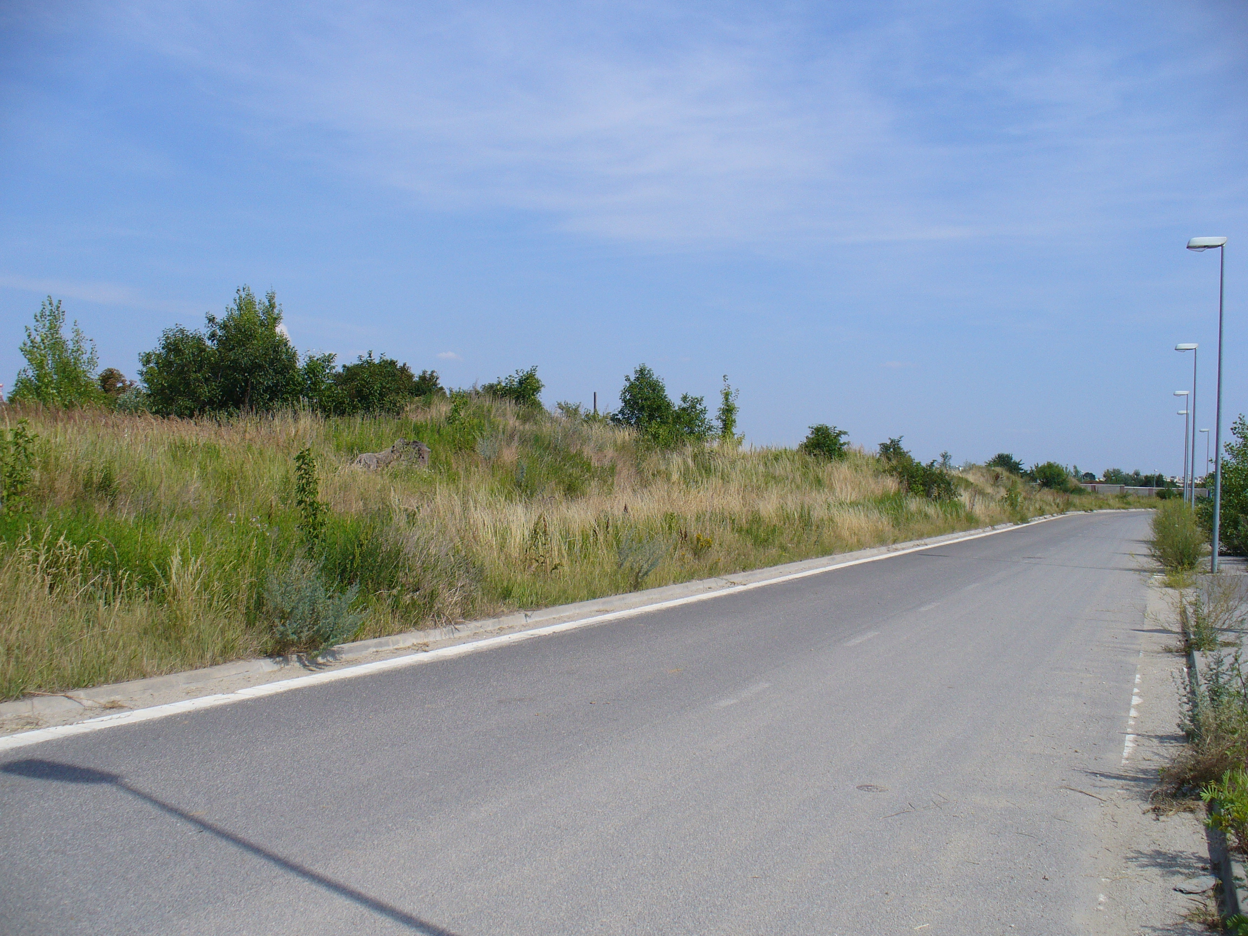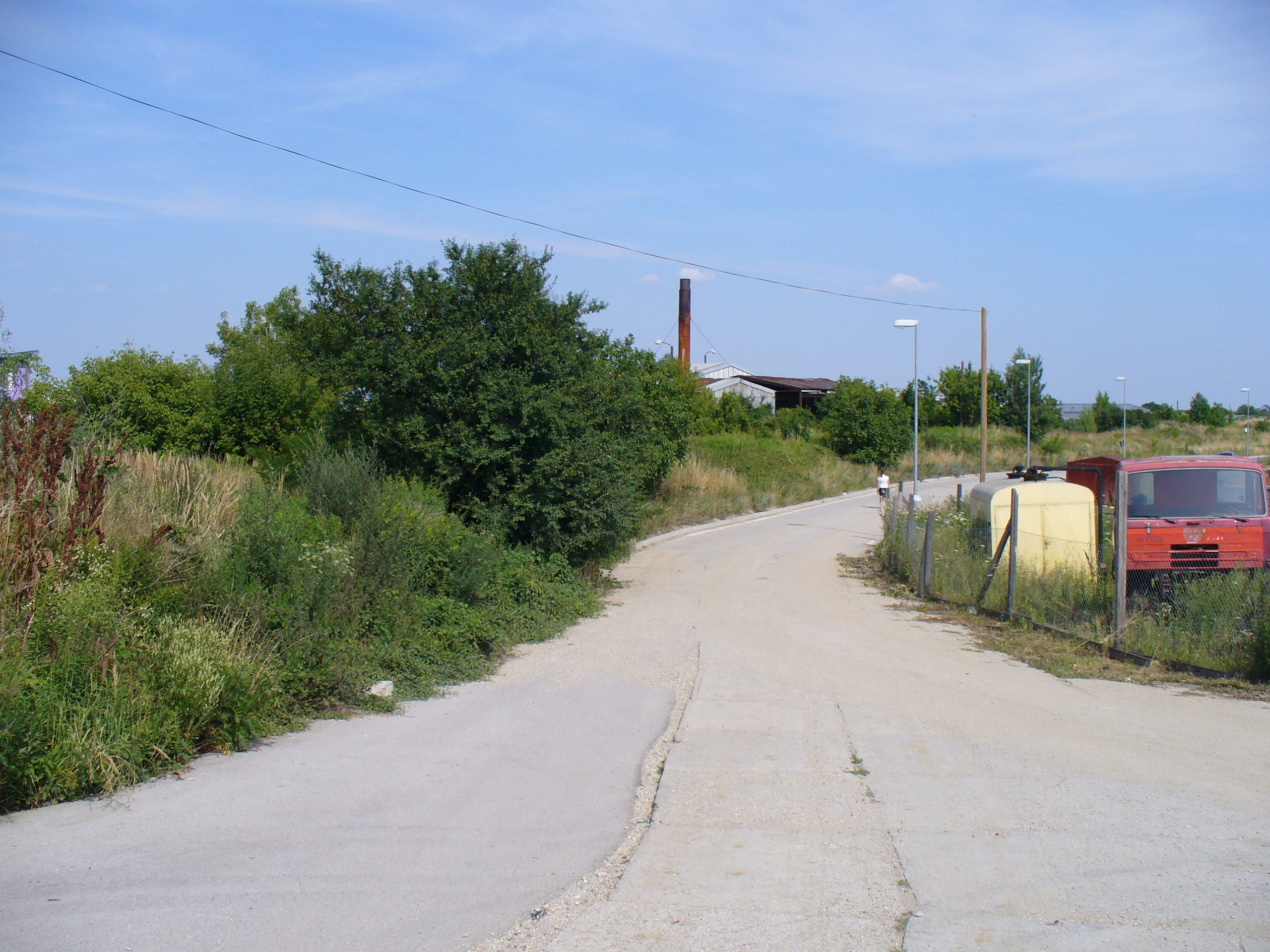 Pohľad od ZSZ na VJV na skládku odpadu. Skládka je na ľavej strane cesty. V pozadí sú budovy situované na skládke odpadu.