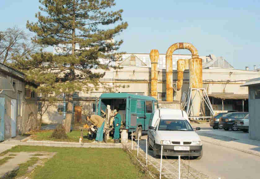 Odber vzorky podz. vody pred neutralizačnou stanicou. V pozadí je hlavná výrobná hala.