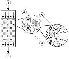 Vysvetlivky: 1 – znečistený vzduch, 2 – CO2 + vodná para, 3 – plynná fáza, 4 – biofilm, 5 – pevná fáza.