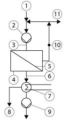 Vysvetlivky: 1 – znečistený plyn, 2 – ventil, 3 – prísun, 4 – membránový modul, 5 – membrána, zadržané látky, 6 – presiaknuté látky, 7 – chladič, 8 – kondenzát, 9 – vákuová pumpa, 10 – koncentrát, 11 – vyčistený plyn.