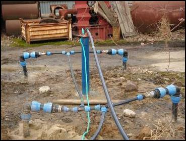 Obr. 5.1.32. Vojany – prevzdušňovací vrt a štvorica odsávacích ventingových vrtov (foto GEO Slovakia, s. r. o.).